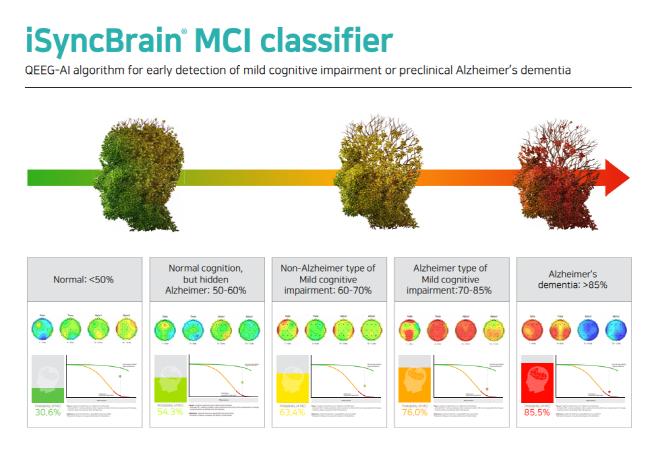 ‘아이싱크브레인-M(제품명: iSyncBrain MCI Classifier)’은 뇌파 빅데이터를 활용한 기억장애형 경도인지장애(aMCI) 선별 보조시스템이다. 치매로 이행하기 전 단계인 경도인지장애의 가능성을 인공지능 알고리즘을 통해 확률로 제시함으로써 본격적인 치매가 발생하기 전 예방적 치료를 통해 치매로의 진행속도를 지연시키는 것을 목표로 한다.