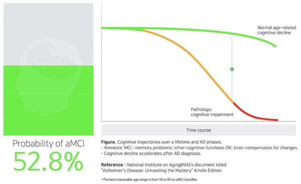 개인 뇌파 분석시 aMCI 가능성과 함께 기존 논문에 발표된 정상 aging과 알츠하이머 형의 인지 그래프를 참조 자료로 함께 제공한다.